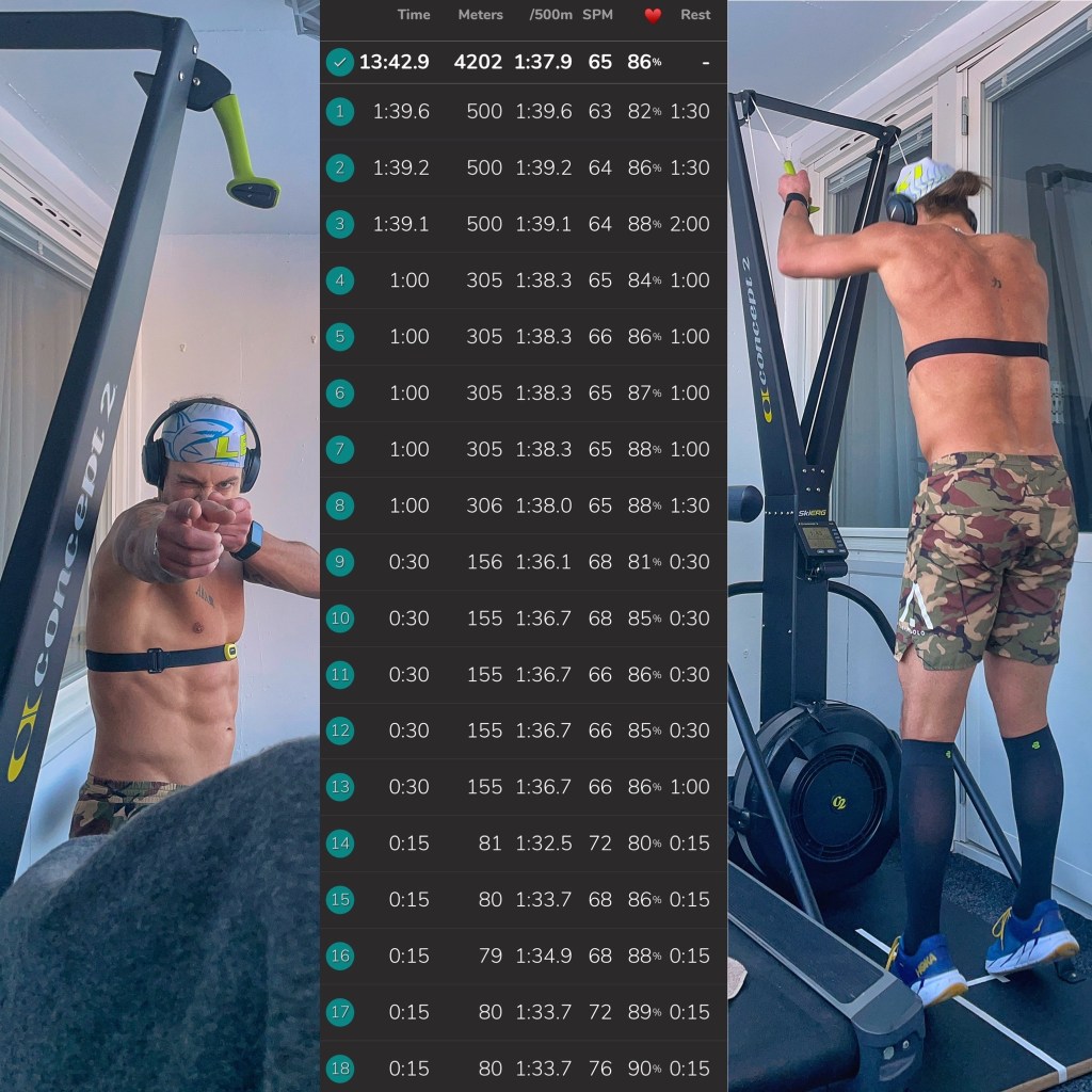 Jag körde en uppvärmning på tio minuter först i sub 2,00 min/500m-fart , med 20 snabba drag vid minut fyra och nio.